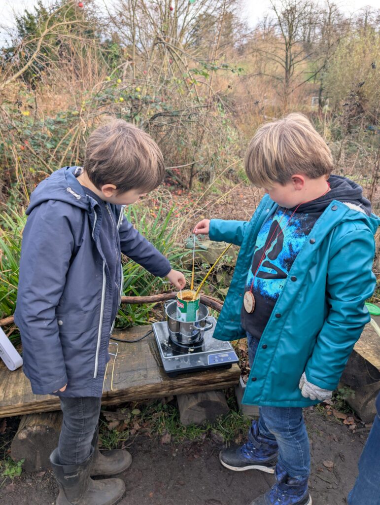 Frisch gestärkt ging es am Nachmittag mit einer großen Portion Tatendrang weiter. Nun durften die Kinder selbst zu echten Naturhandwerkern werden. Jedes Kind entschied sich, welche der kreativen Aktionen es ausprobieren wollte – und schnell füllte sich der Platz vor dem Tippi mit emsiger Betriebsamkeit, fröhlichem Stimmengewirr und dem einzigartigen Geruch von Feuer und warmem Wachs.