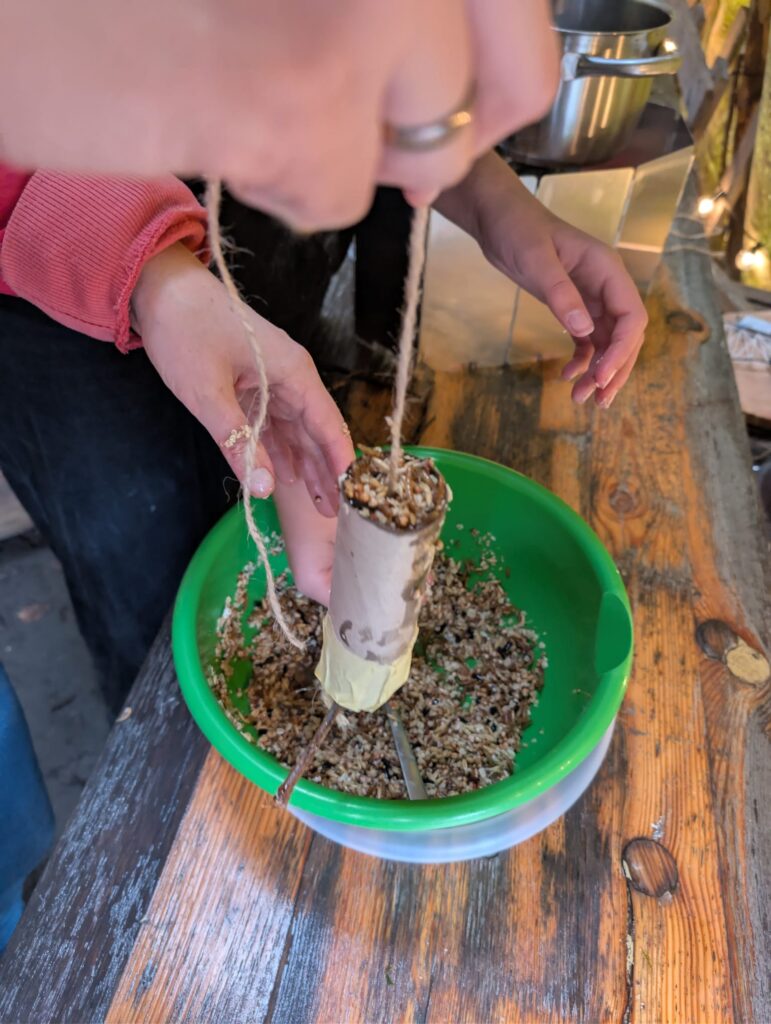Nebenan wurde fleißig gemischt, geknetet und geformt: Hier stellten die Kinder Meisenknödel selbst her, ein kleiner, aber wertvoller Beitrag zum Naturschutz. Mit warmen, leicht fettigen Händen pressten sie Körnermischungen in Formen, banden Schnüre ein und überlegten gemeinsam, an welchen Stellen im Garten oder im Wald die Vögel die Knödel besonders gut finden würden. Währenddessen lernten sie ganz nebenbei, warum Zusatzfutter für Wildvögel – besonders im Winter – so wichtig ist.