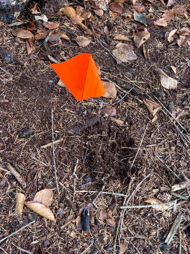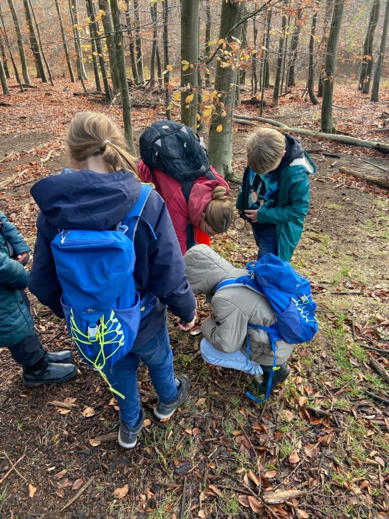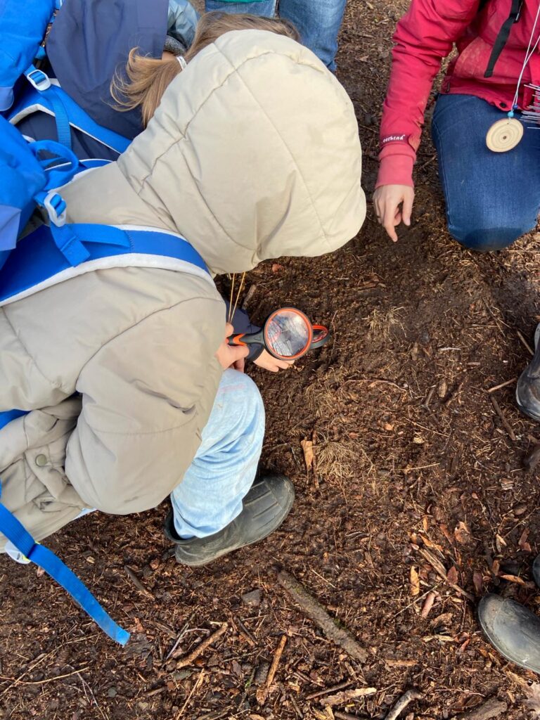 Kurz darauf ging es hinaus in die Natur mit Sarah. Zwischen raschelnden Blättern und den Geräuschen des Waldes begaben sich die Kinder auf eine echte Spurensuche. Ausgestattet mit Lupen, Fahndungsfähnchen und Bestimmungskarten erkundeten sie unterschiedliche Lebensräume und entdeckten, wie sich die Natur im Wandel der Jahreszeiten verändert. Mit viel Begeisterung probierten sie aus, wie man Tierspuren deutet oder Bäume bestimmt – ein kleines Abenteuer für alle Sinne. Mit den vielen Fähnchen im Wald sah es aus wie ein Tatort.